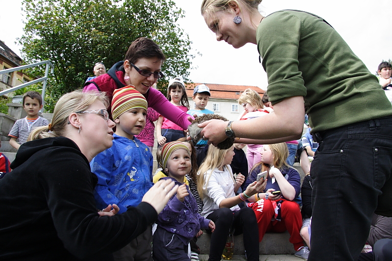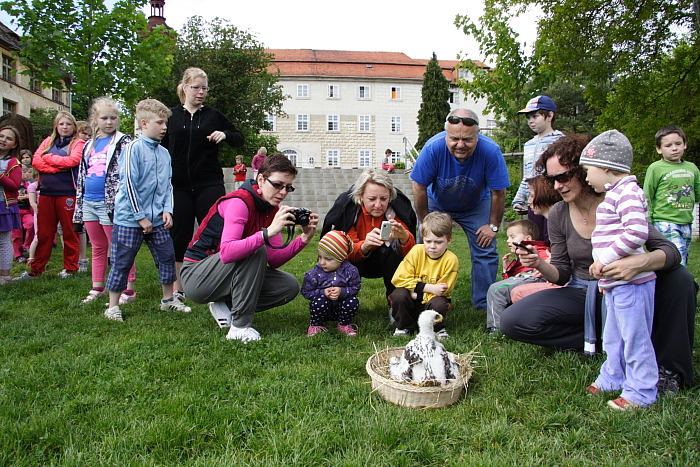 Poté se všichni přesunuli na zámeckou zahradu. Honza s Lenkou přivezli ze záchranné stanice malé lišče, ježka, supa, raroha, sovu pálenou a další dravce. O všech těchto zvířátkách a ptácích vyprávěl Honza mnoho informací a poté předvedl s několika dravci i letové ukázky. Kdo chtěl, měl také možnost vzít si dravce na sokolnickou rukavici a vyfotografovat se s ním. Fotografy mile překvapilo nadšení a velký zájem dětí, které měly stále plno otázek, došlo i na pár příběhů z fotografování a tak nám všem odpoledne příjemě uteklo.