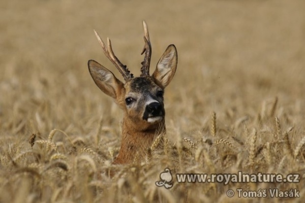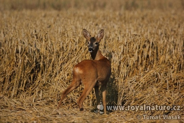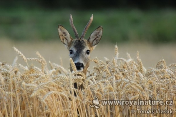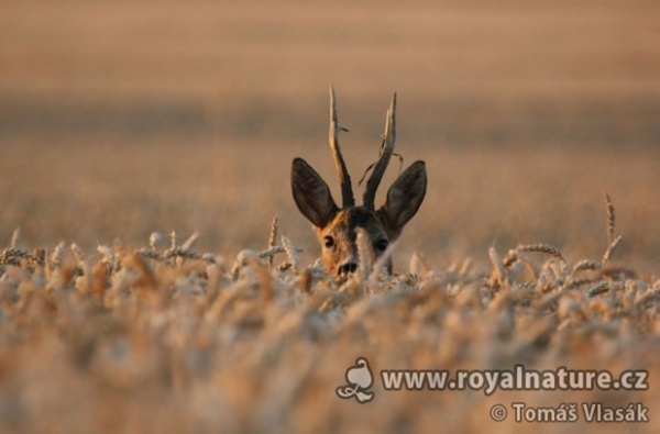 Den se pomalu chýlí ke svému konci a sluníčko zanedlouho ulehne pod obzor. Procházím po posečeném pásu uprostřed pšeničného lánu a v daném okamžiku spatřím srnce asi šedesát metrů ode mne. Zastavím, přikrčím se za stěnu pšenice a loudím první jemné pískání ze své vábničky. Srnec prodírající se pšenicí postupuje velmi pomalu a opatrně. Jedná se o zkušeného, staršího srnce. Najednou se ozve šustění a srnec vychází z obilí. Ohlíží se na mně, a tak mám jedinečnou příležitost pořídit první snímky. Za stálého vábení srnec postupuje stále blíž. Poté se zastaví a zjišťuje, že byl oklamán.