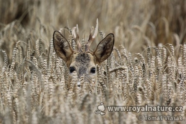 Přicházím do míst, kde rozsáhlé polní ekosystémy z jedné strany obklopují hluboké lesy s přičleněnými remízky, z té druhé jsou lemovány stromořadím podél polní cesty. Již několik let jsem této lokalitě věrný a chodím sem pravidelně srnce vábit. Srnčí říje byla v plném proudu. Stojím v koleji od traktoru v pšeničném lánu a začínám vábit, když se vtom uprostřed lánu asi třicet metrů ode mne objevuje srnec. Zbystřil, ohlíží se kolem sebe a poté postupuje pomalu kupředu za hlasem jemného pískání, vydávajícího z vábničky. Srnec se v zápalu touhy ani jednou nezastavil, šel přímo proti mně. Když byl na vzdálenost zhruba tří metrů, zastavil se. V té chvíli jsem neváhal ani minutu a zmámeného srnce fotografoval…